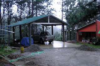 The truckport has a roof! It's not completed yet, but it provides shelter from the rain. It's a lot more than we expected, unlike the terrace roof, which is exactly as we envisioned. Adam, the contractor, decided to make the truckport with the same type of peaked roof as on the casita. It has style and we like it. It also has mucho headroom.